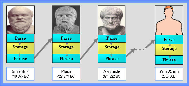 Up till now we discussed the communication between 2 persons at the same time. However, knowledge transfer is not limited to the present but it also links to the past. An important part of our knowledge is invented by previous generations. The transfer mechanism is much the same. The main difference is that time restricts the feedback. For example, in figure 1.4 there is no way that Aristotle could have communicated with Socrates or that we can communicate with Plato. However, the idea's of these men has come to us and they profoundly influence our daily lives.