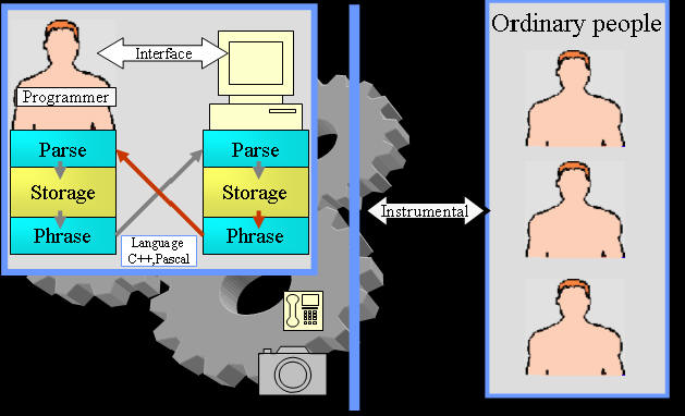 To judge the added value of this architecture, consider today's main use of computers as illustrated in figure 1.6. The most obvious feature of the illustration is that only half of the communication cycle is used. At the side of the machine there is no phraser that can systematically put stored knowledge into words 1). A second obvious feature is that ordinary people can not communicate with the computer in a direct way. They need a programmer as a middle man. In order to decide whether these features pose a serious problem or not, one has to differentiate between static and dynamic knowledge.
