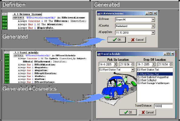 If you define in Fonal the world as it is (W1) and the world as it should be (W2), CommunSENS directly deduces which process (and all its intermediate states) leads from W1 to W2. So even programming a process boils down to formulating declarative sentences. In chapter 5 these principles are used in building a heavy business rules case.