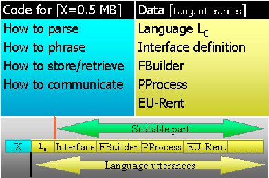 These four basic skills were programmed in C++ which resulted in a small DLL of about 0.5 MB called X. All other kinds of knowledge is considered as data or better as language utterances. Figure 3.2 gives an overview. As can be seen, the language it self is not a part of X.