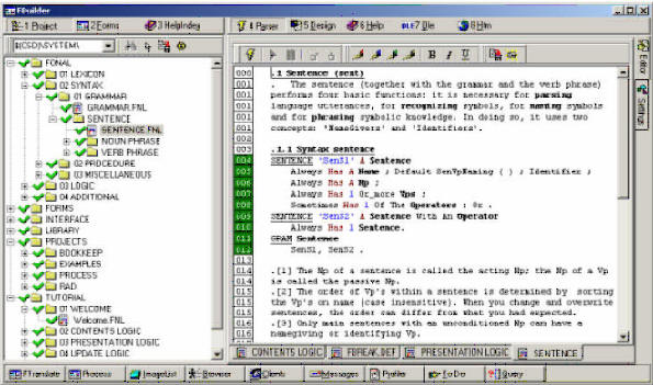 At the left side there is a project tree that allows navigation through all projects. These projects include a linguistic definition of the language itself, linguistic definitions of the builder forms (including the project and parser forms themselves), linguistic definitions of the user interface, etc. At the right side of the main form there is the parse editor. The editor shows the contents of the file that is selected in the project tree. In this editor you can enter new language utterances that define an extended image. Now, updating the initial image of the world is nothing more than parsing (or deleting) these language utterances. If you parse new utterances you act as moulder who uses modelling clay to build the image. If you delete utterances you act as the sculptor who removes those stone particles that hide the image.