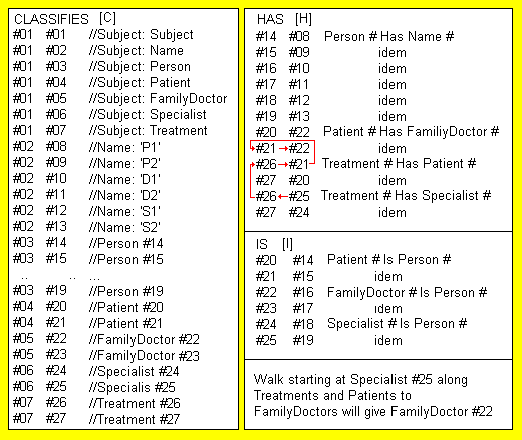 Instead of showing the formulas, an example is given. Figure 7.1 sketches a situation where a family doctor has referred a patient to a specialist for treatment. The (partial) image of the situation is stored in three tables each containing the relevant ordered pairs. The symbol numbers are choosen arbitrairy.
